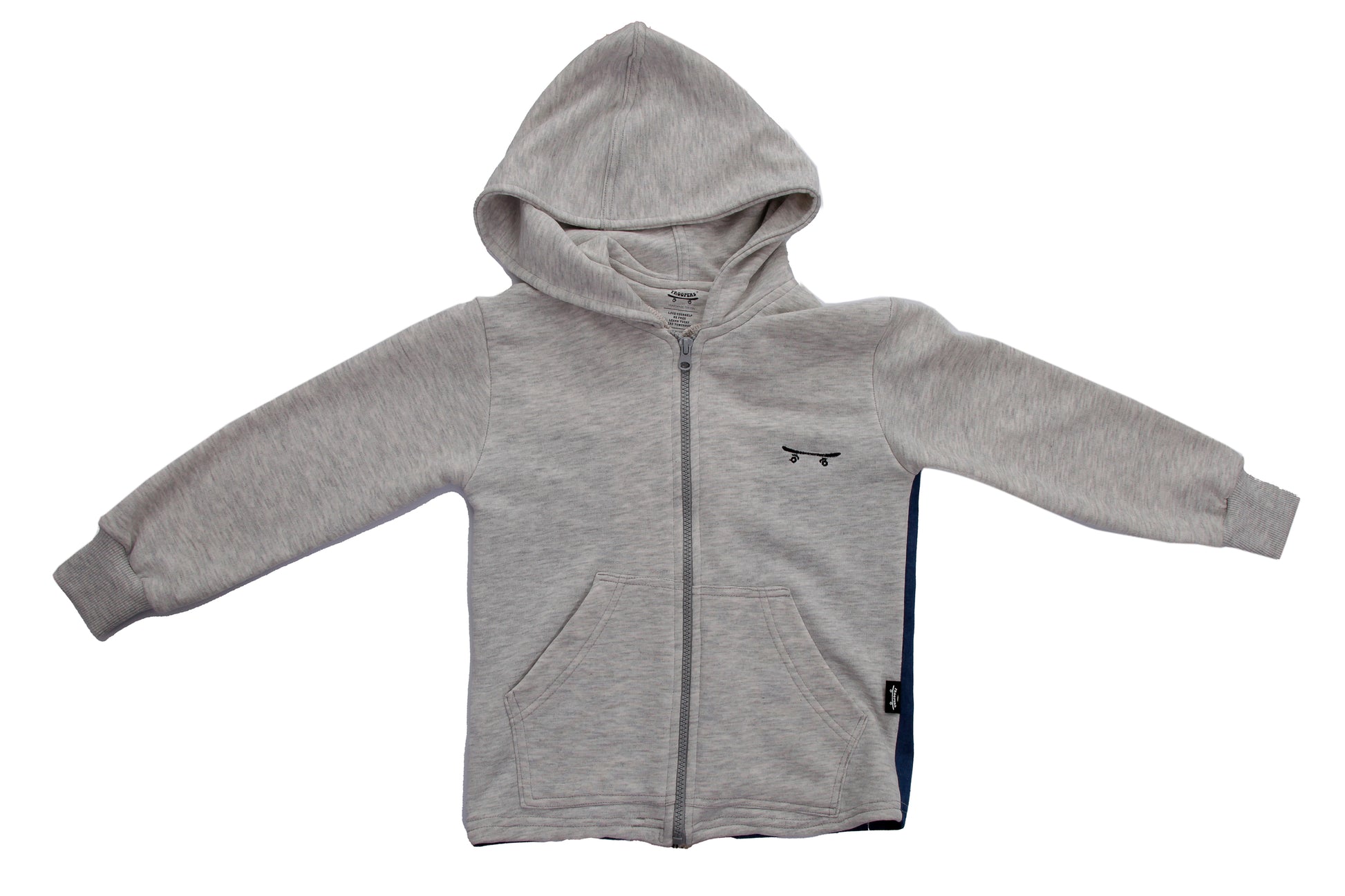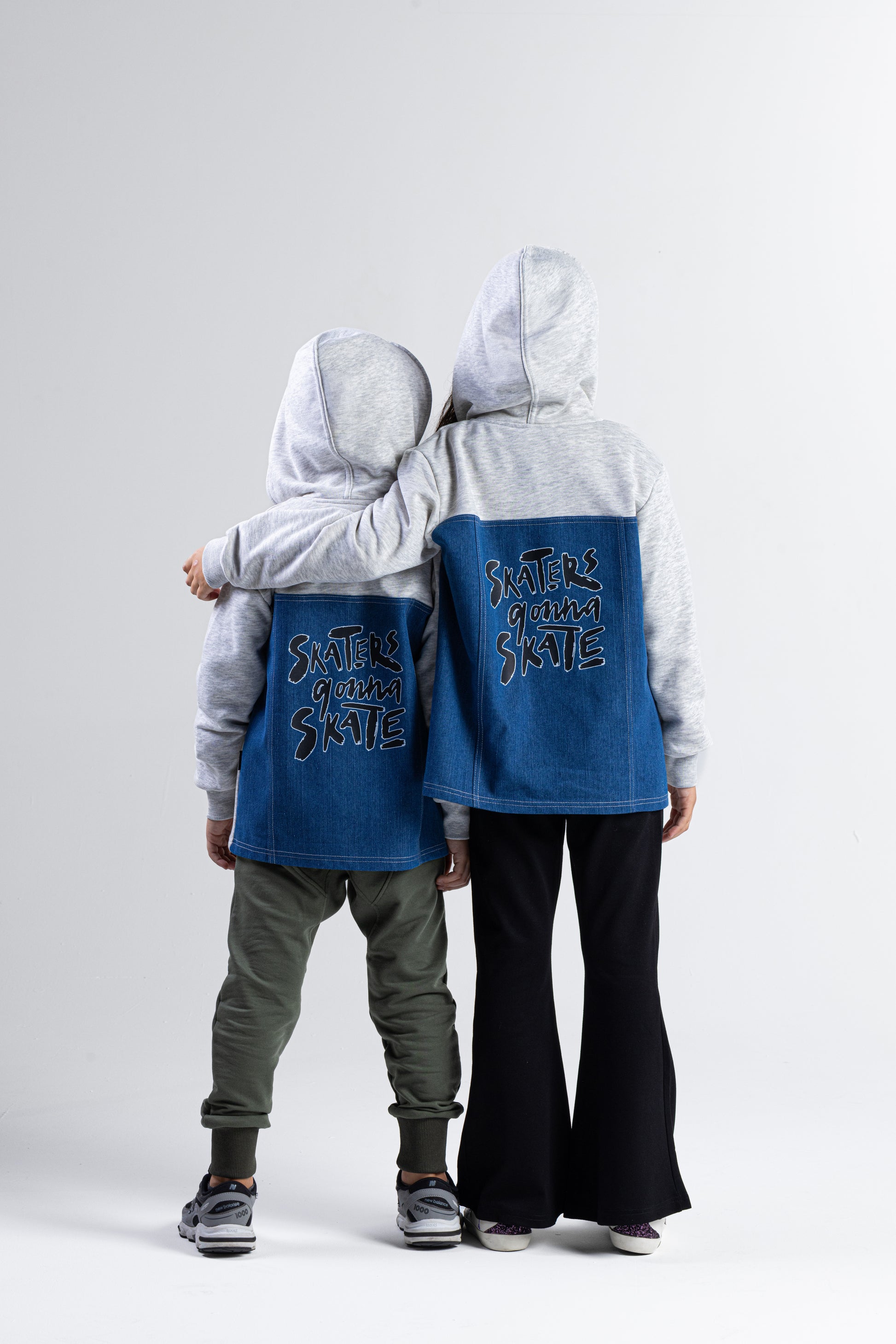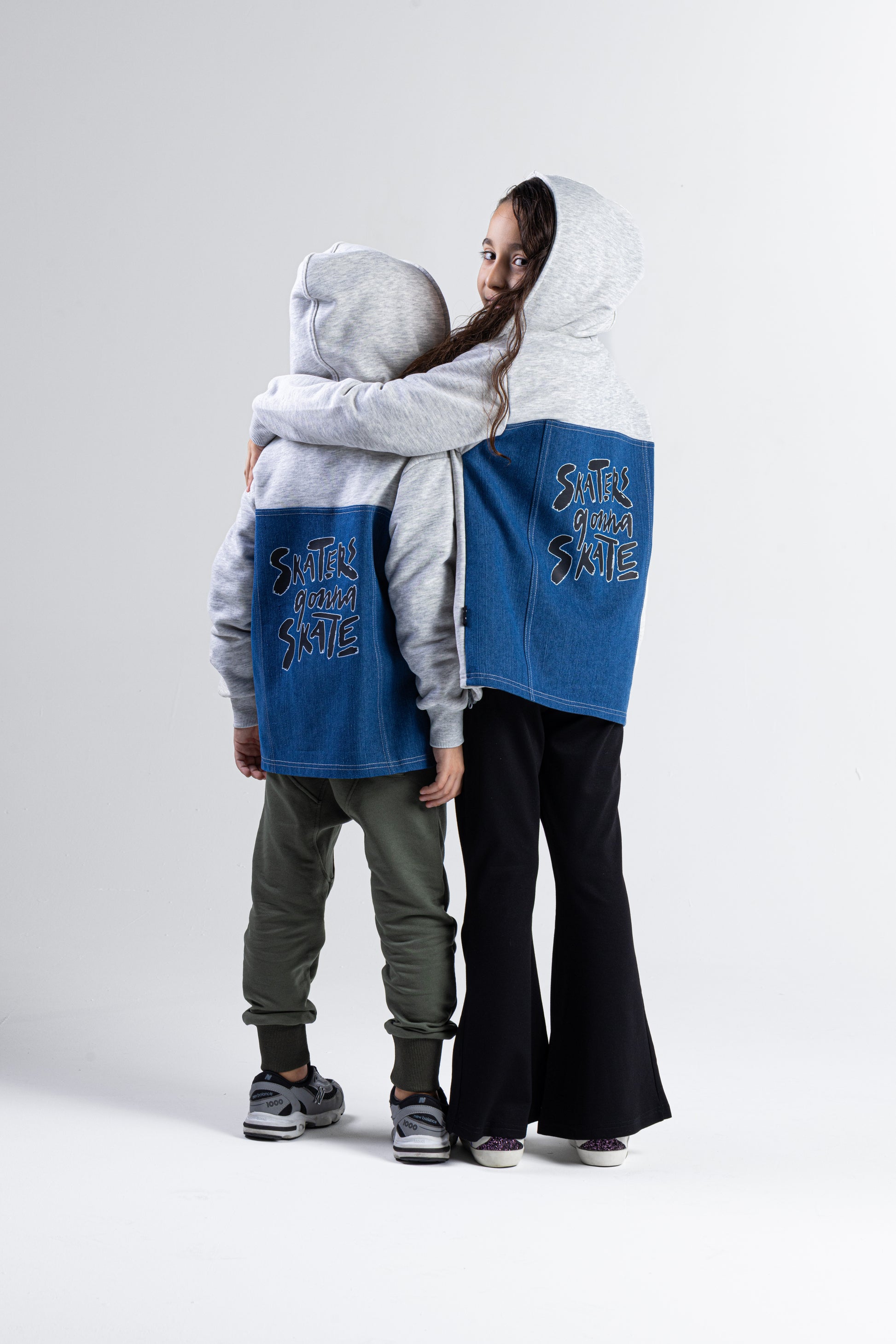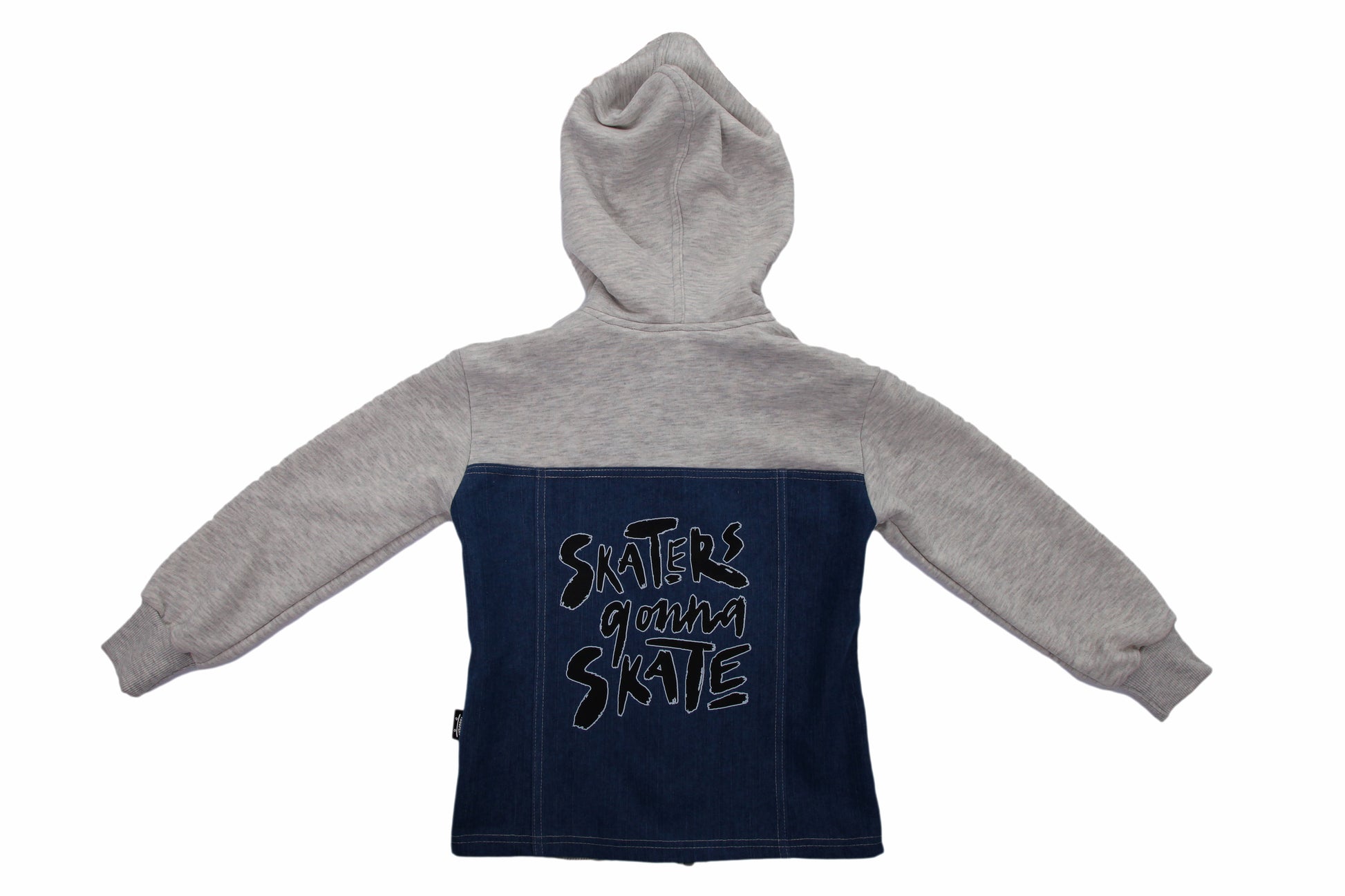 Unisex grey and denim zipped hoodie, perfect for any day.
